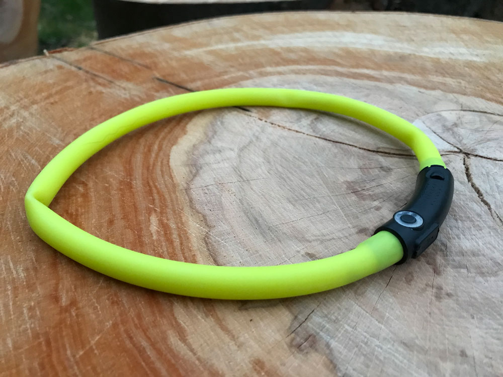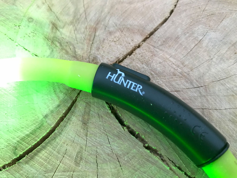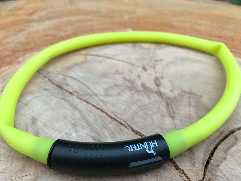Jedná se o silikonový dobíjecí svítící LED obojek Hunter, je k dostání v několika barevných provedení a je vhodný pro psy s obvodem krku 20 – 70 cm. Ano čtete dobře, byl to vlastně hned první problém, který jsem řešila, jakou délku zvolit, bála jsem se, že příliš malý nebude v chlupech vidět, ale jak správně délku odhadnout. Tento obojek to vyřešil za mě, koupíte si jednu délku a podle potřeby si jej zkrátíte doma už přímo po vyzkoušení na psovi.