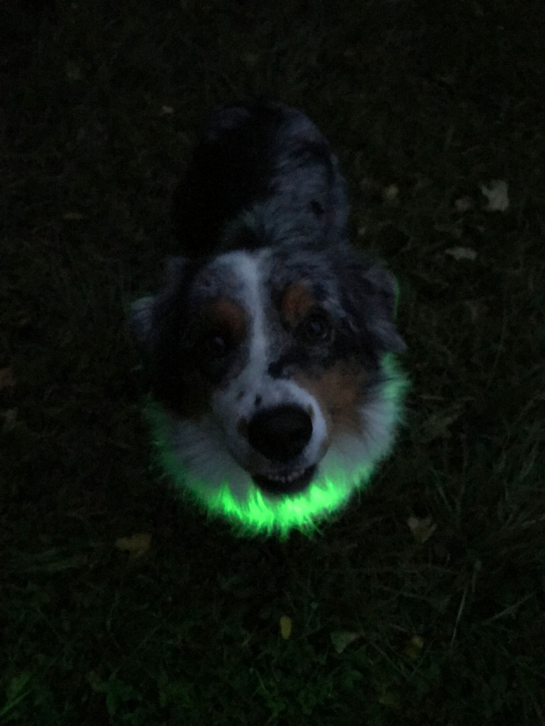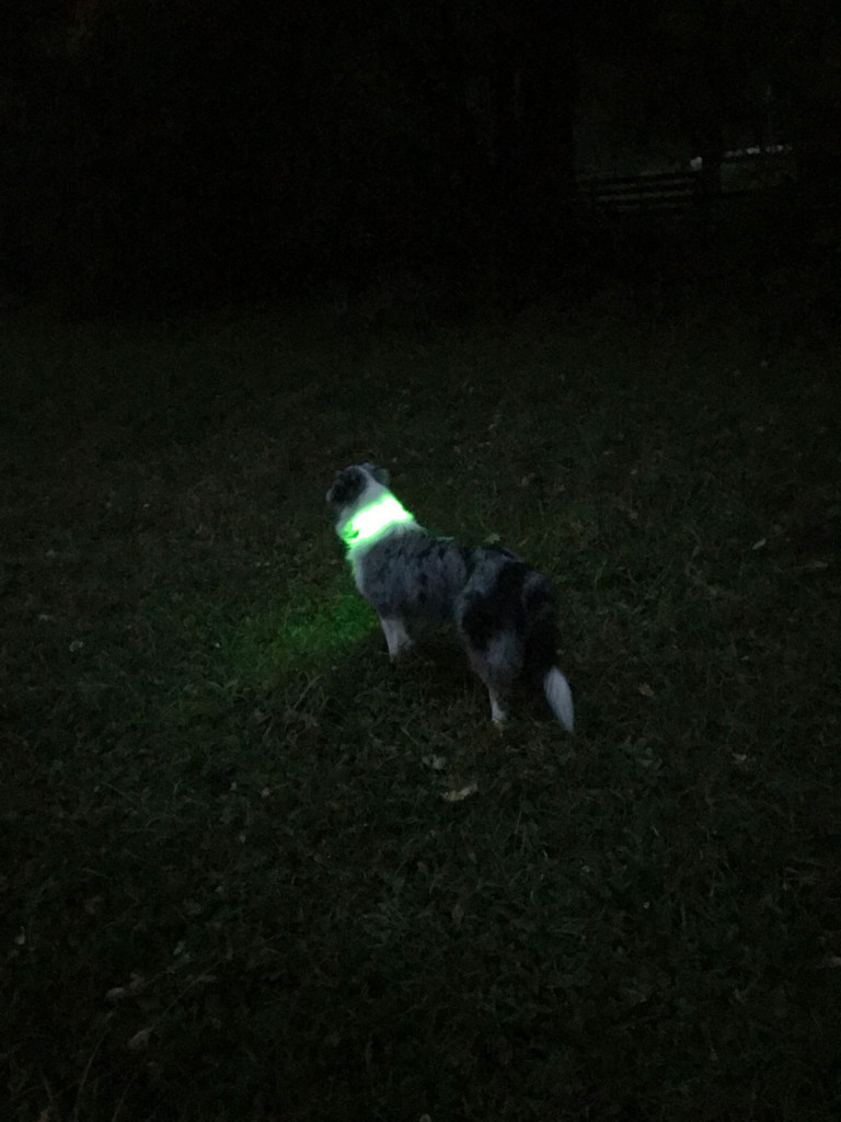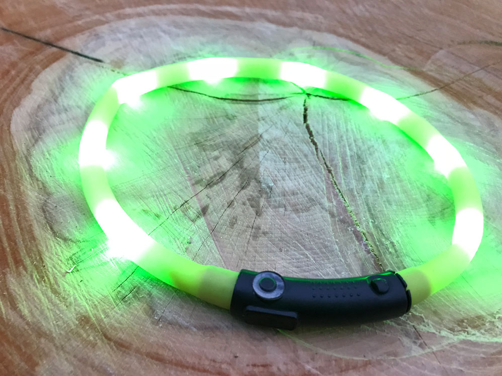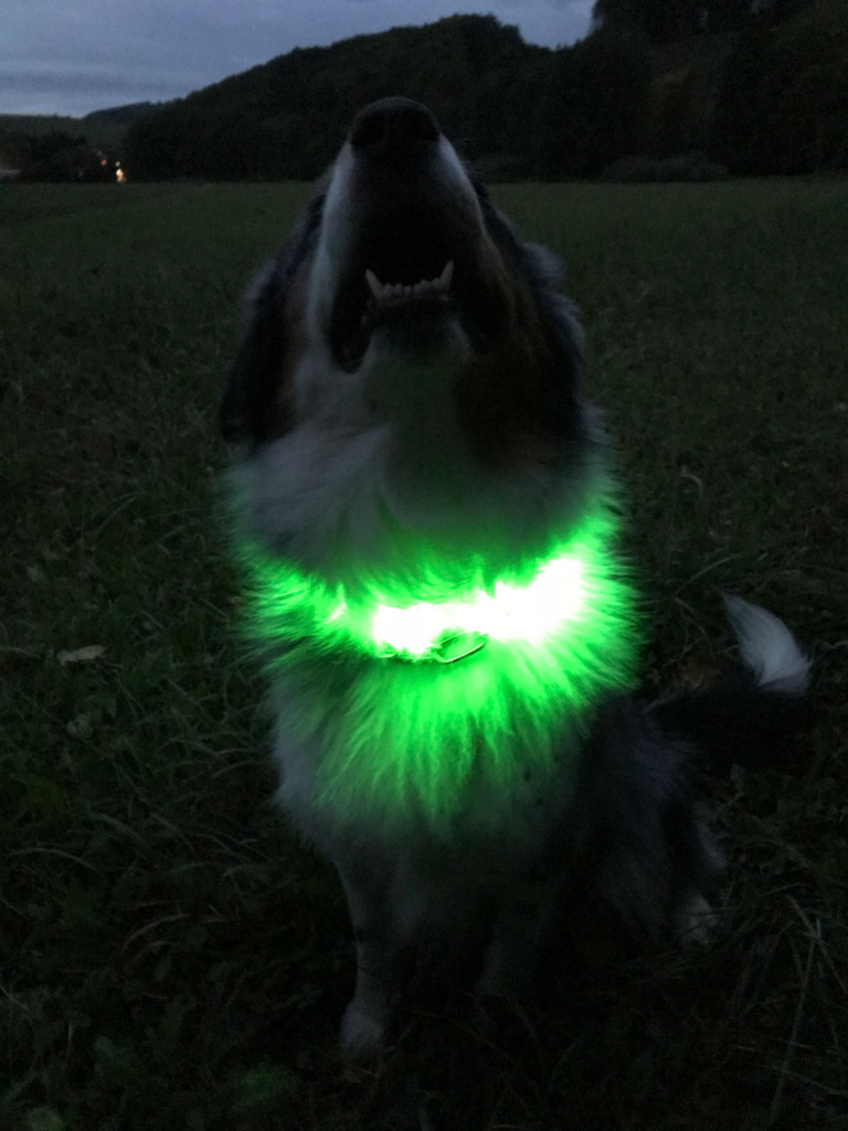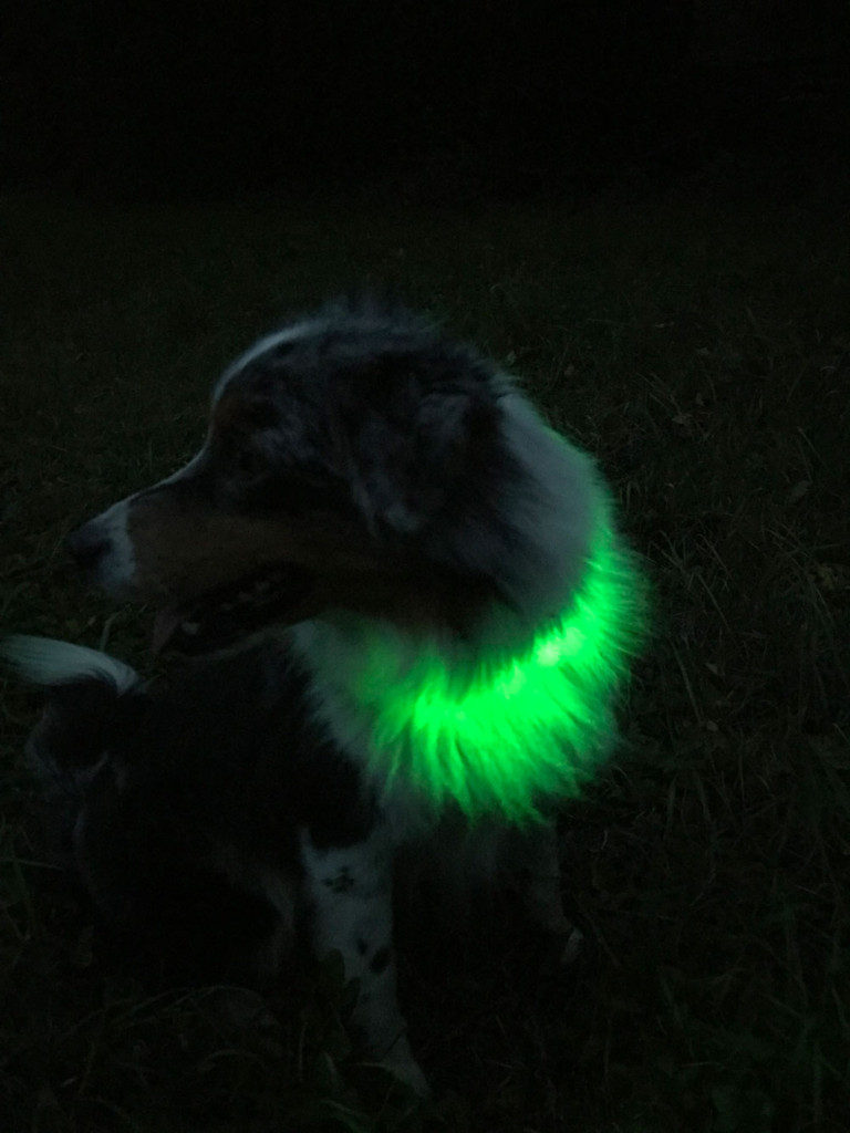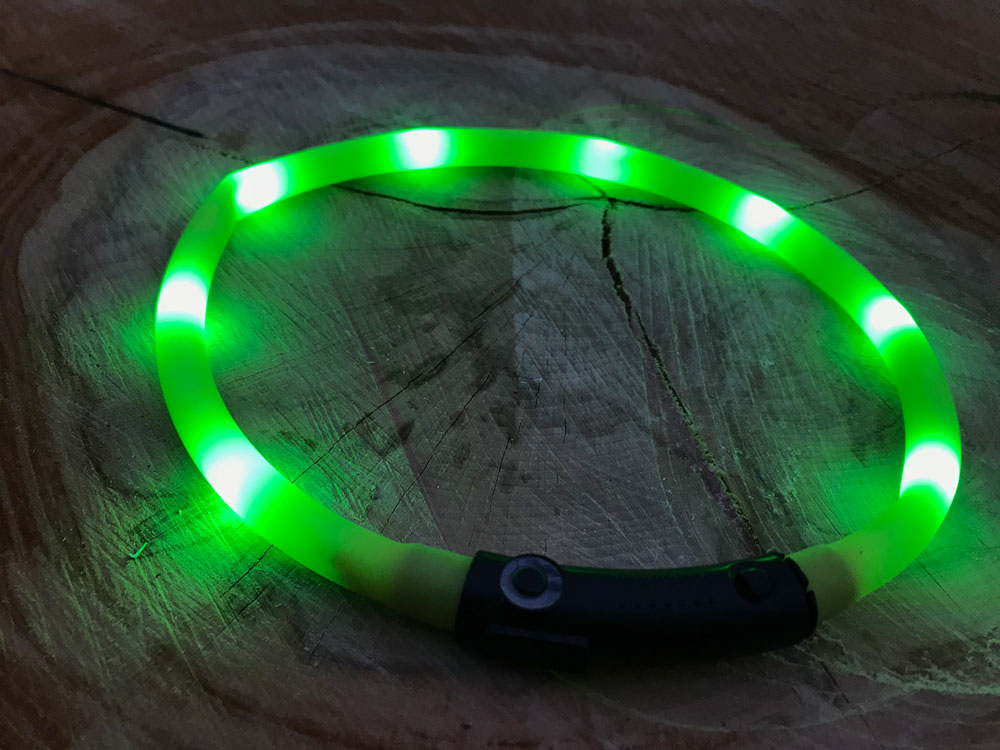 Zvolila jsem zelenou variantu, je hezky viditelná, červená se může plést se zadními světly automobilů. Ztracení obojku v chlupech se nemusíte obávat, jelikož jde krásně vidět i skrz ně.