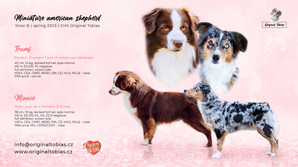 Jsme hrdí, že vám nyní můžeme představit náš plánovaný VRH B Original Tobias, krytí plánujeme na jaro 2023. Maminkou bude znovu naše Minnie (One Love de L’Univers D’Evine) a hrdým tatínkem bude Trumf (Perfect Trumph Card of American Madness).