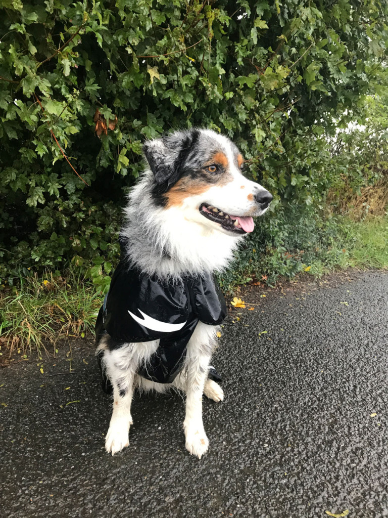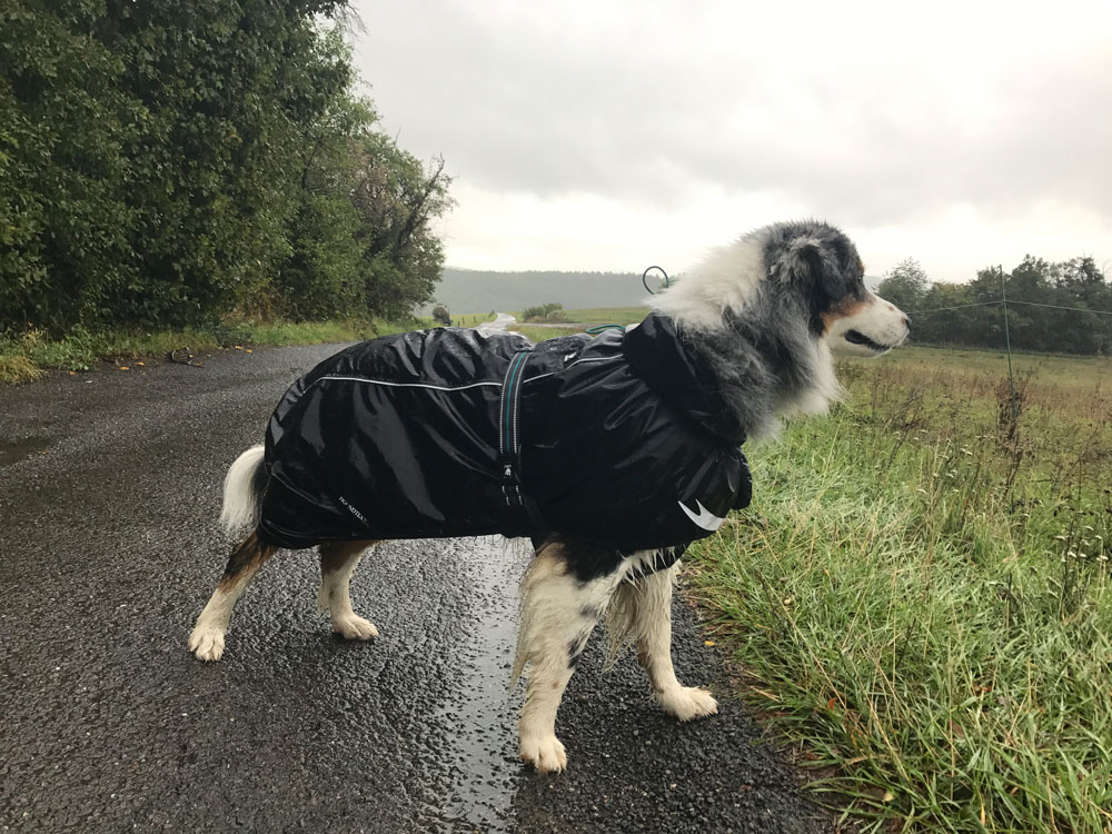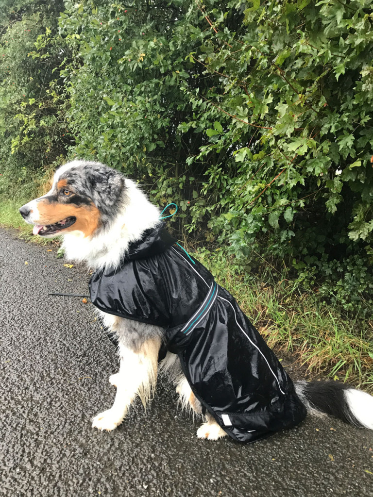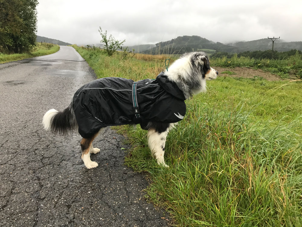 Nyní asi nejvyužívanější kousek ze psí výbavy. Konkrétně máme černou pláštěnku v jalovcovém provedení. Velikost zvolte dle jejich tabulek. Pro Australského ovčáka je to velikost 55, já jsem bohužel dala na měření a zvolila větší velikost a psovi je zbytečně velká, což jsem nepoznala u zkoušení, ale až v provozu.