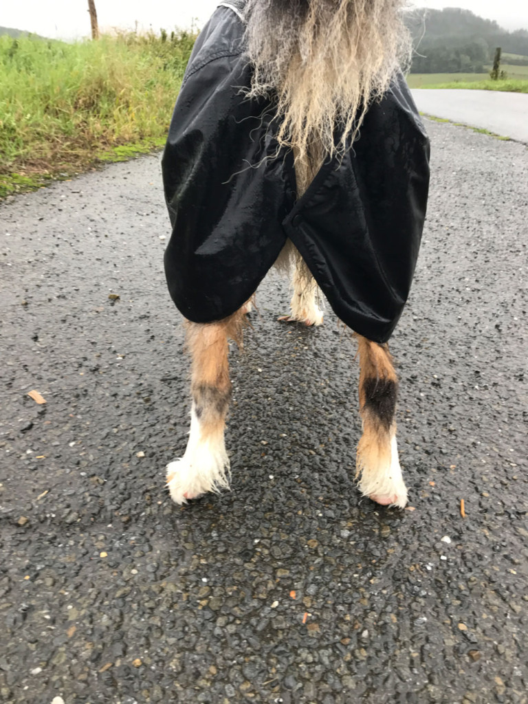 – Gerry (BSP) po jednom propršeném dni, kdy byl s námi celý den venku šel spát do kotce jako vždy, bohužel pršelo i celou noc a teplota byla docela nízko, navíc extrémní vlhkost vzduchu se postarala o to, že mu uschla srst na povrchu, nicméně neproschla až ke kůži. V kožichu se uzavřela vlhkost a on dostal dost nepříjemný hotspot, tedy zapařenou kůži, projevilo se to podobně jako lupy. Na veterině ho oholili do hola, už měl rudé velké vyrážky, z malého kolečka se to však natolik rozlezlo, že měl vyholených hned několik větších ploch. Denně jsme myli speciálním šamponem, sušili, natírali. Nebylo to příjemné ani psovi ani nám, nemluvě o penězích. Toto už znovu riskovat nemůžu.