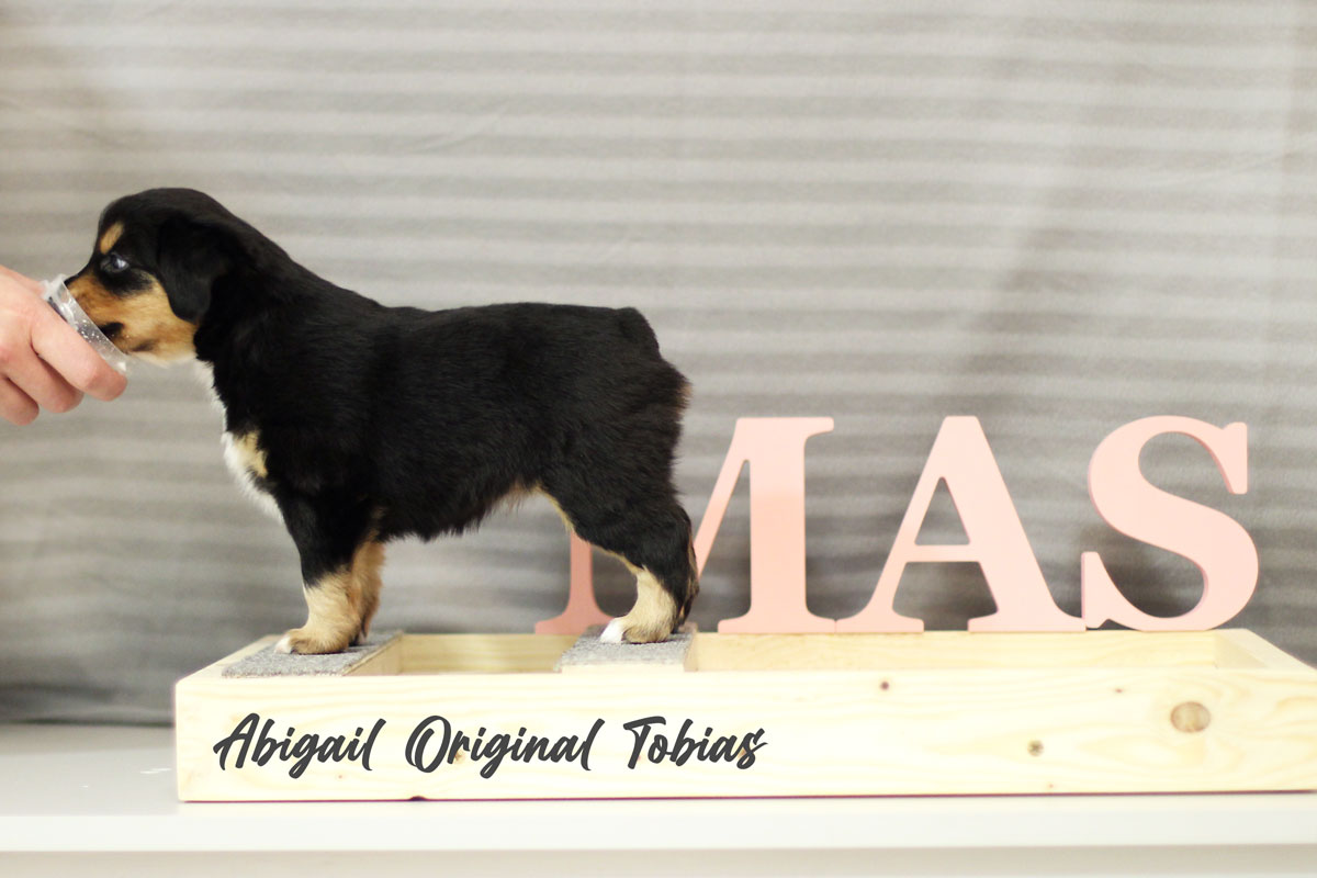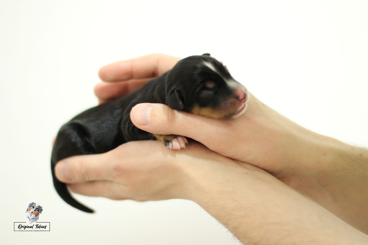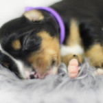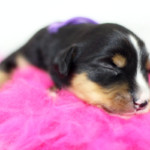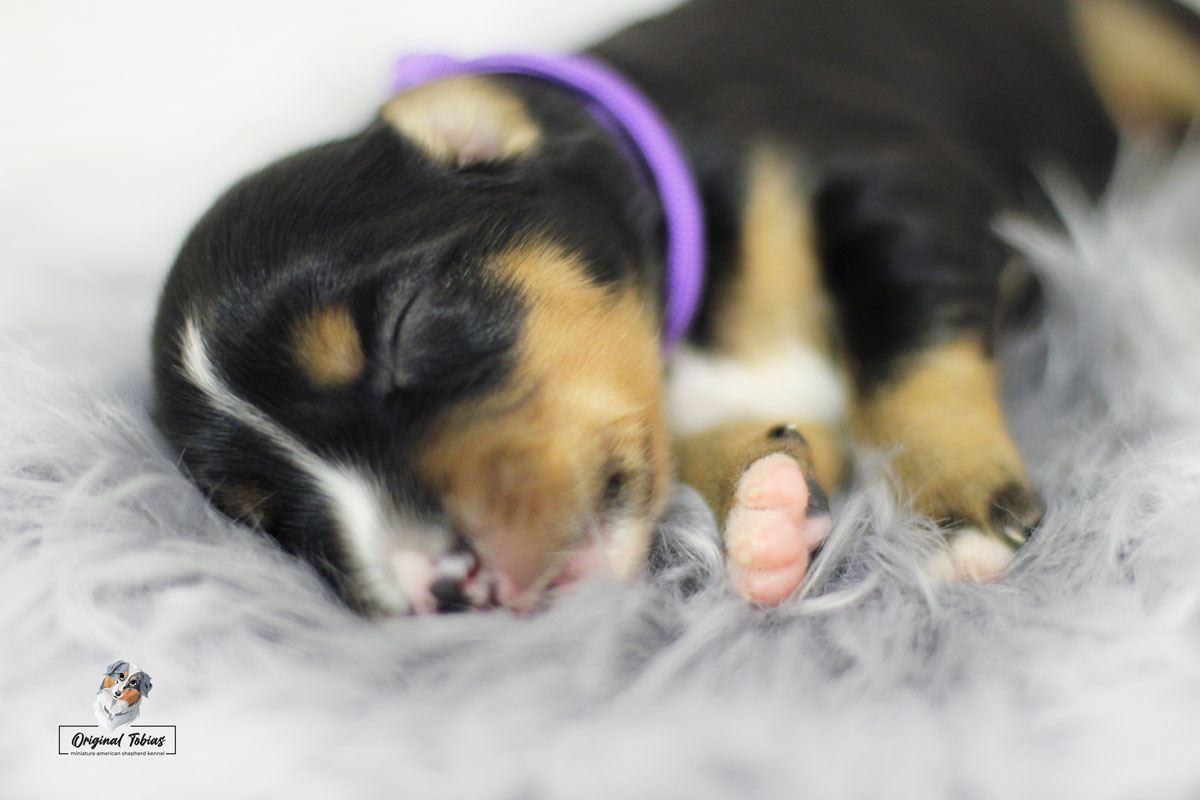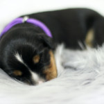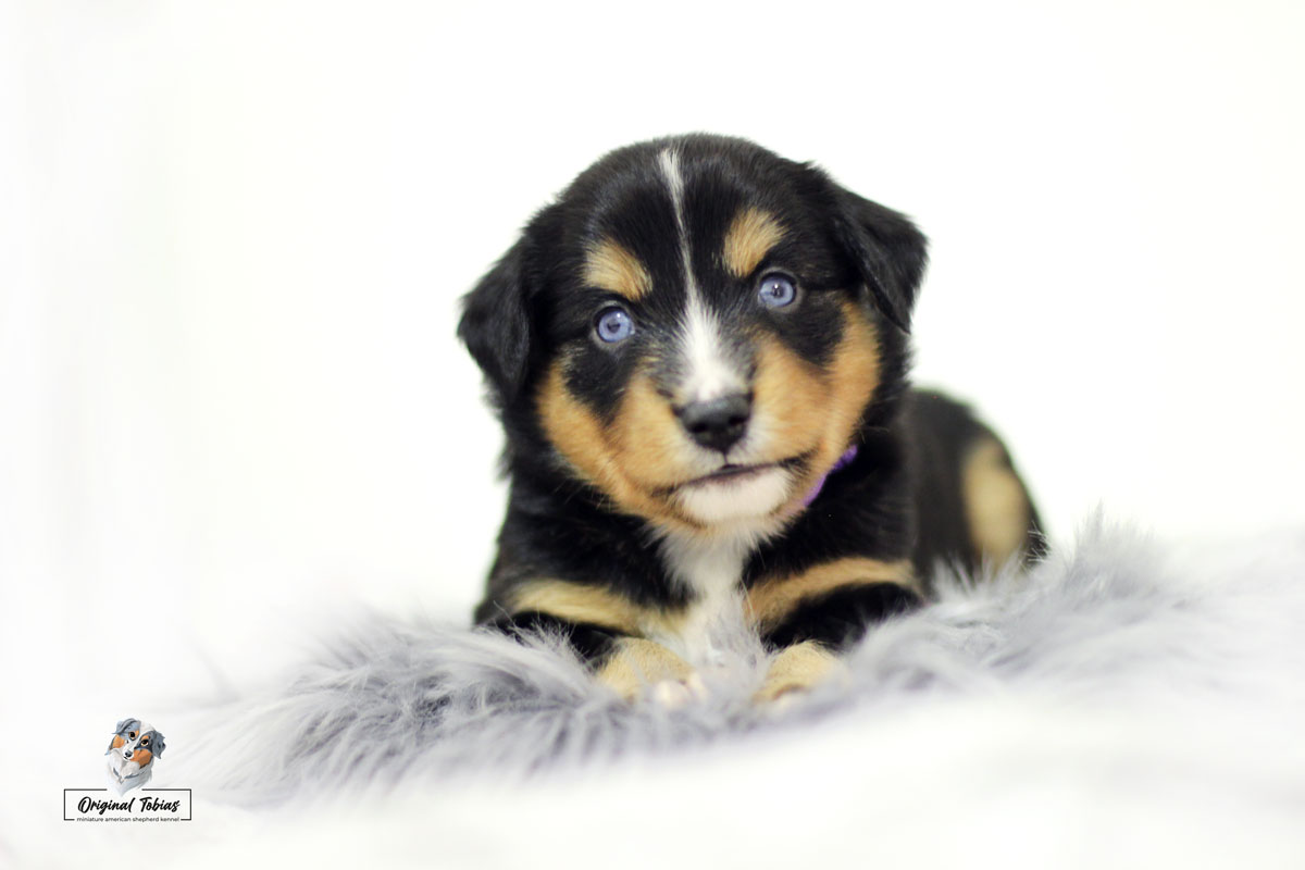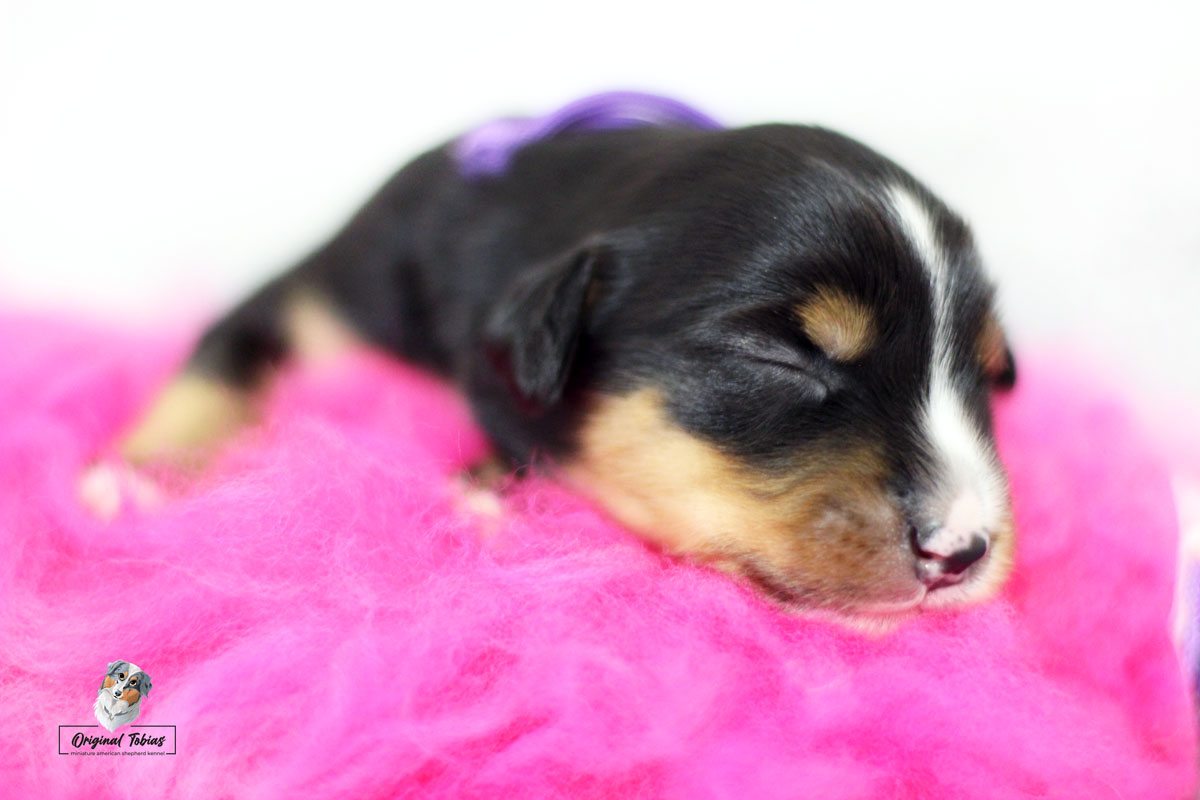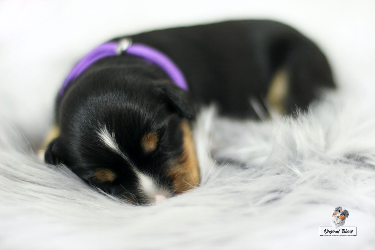 Abigail Original Tobias je black tri fenka, které jsme přiřadili fialovou barvičku. Abigail se narodila jako předposlední štěně s váhou 320 g, v čase 15:50 dne 16. 2. 2021.