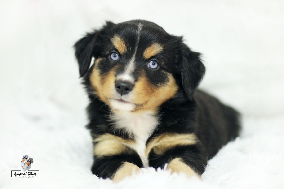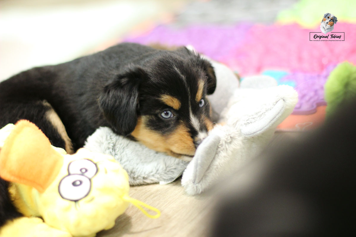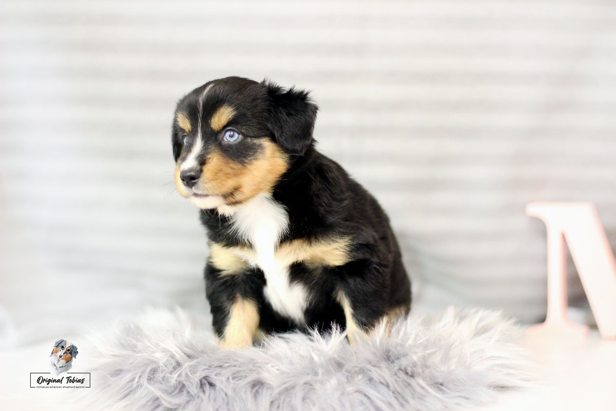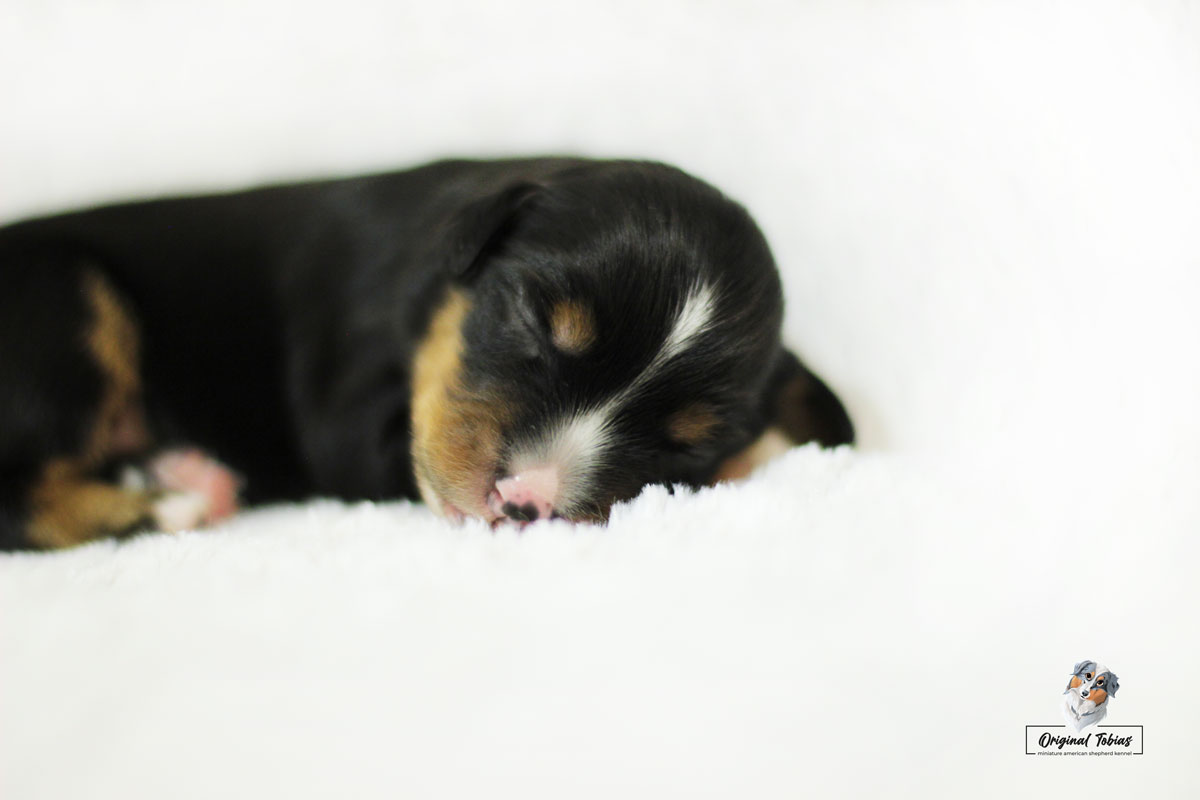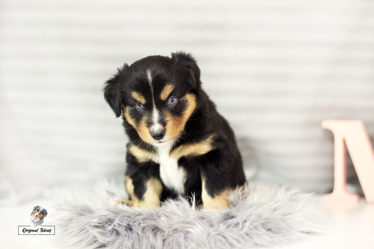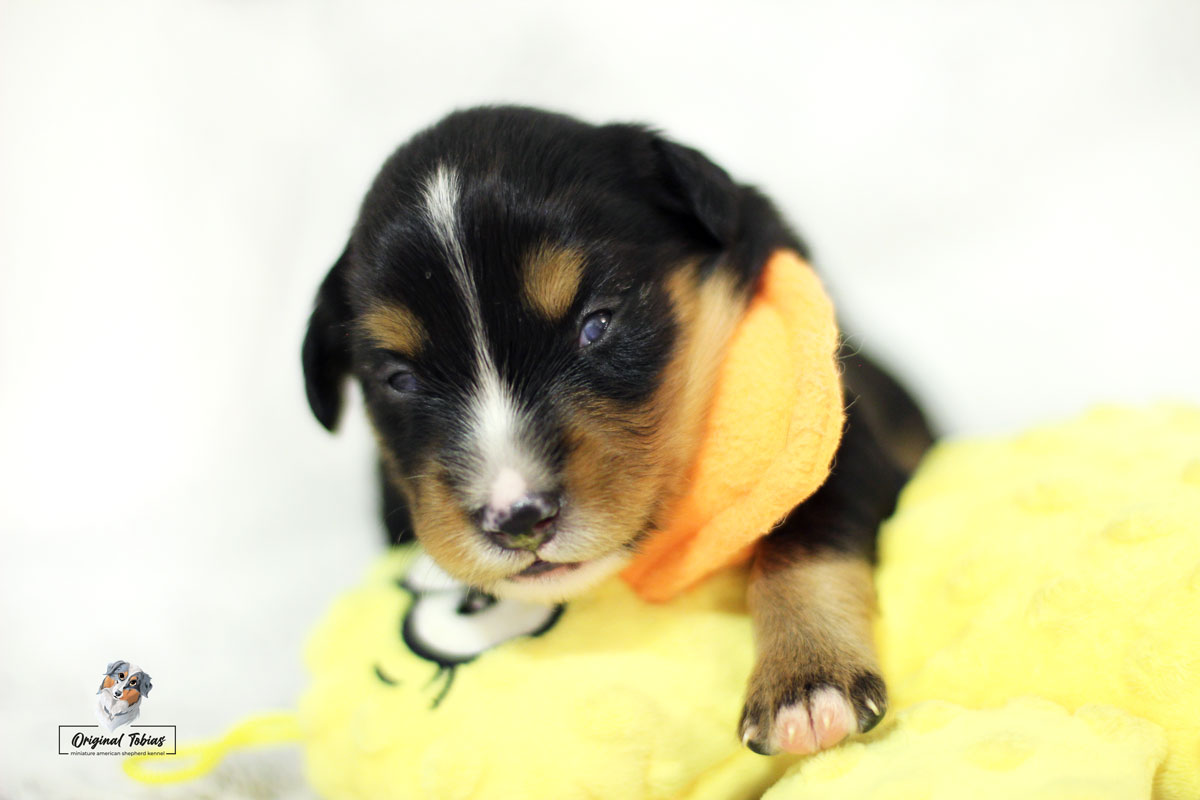 Abigail Original Tobias je black tri fenka, které jsme přiřadili fialovou barvičku. Abigail se narodila jako předposlední štěně s váhou 320 g, v čase 15:50 dne 16. 2. 2021.
