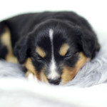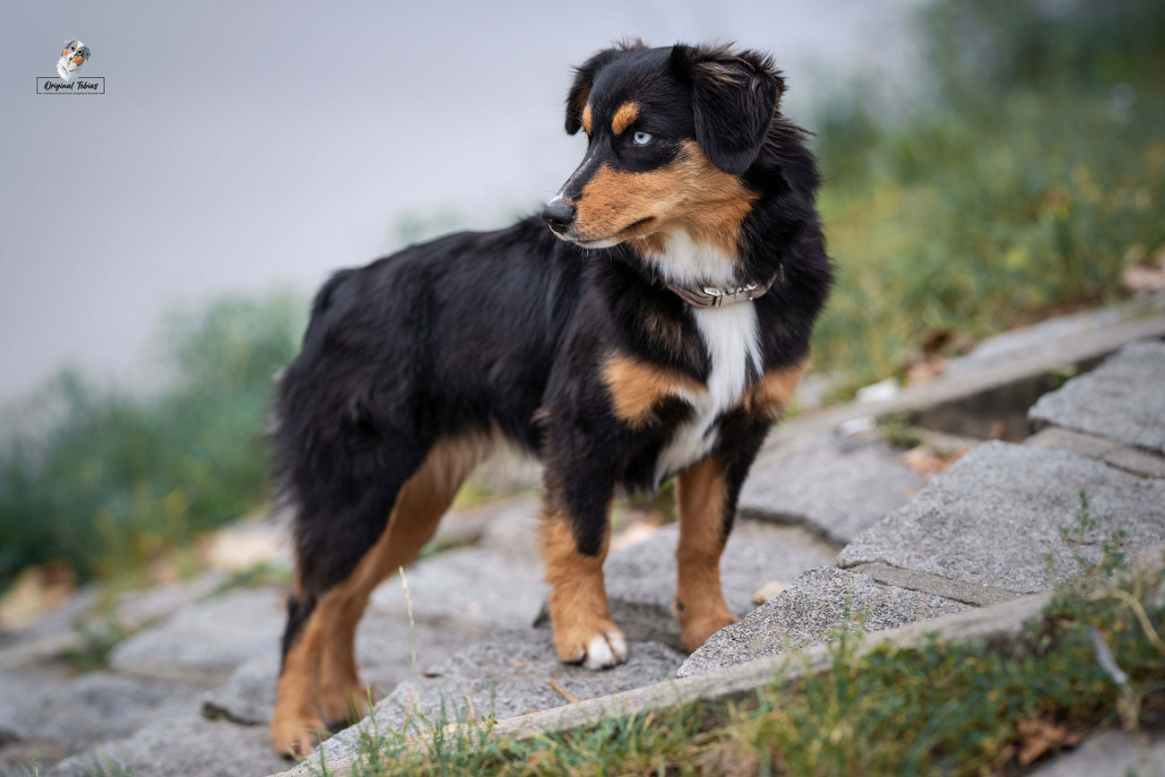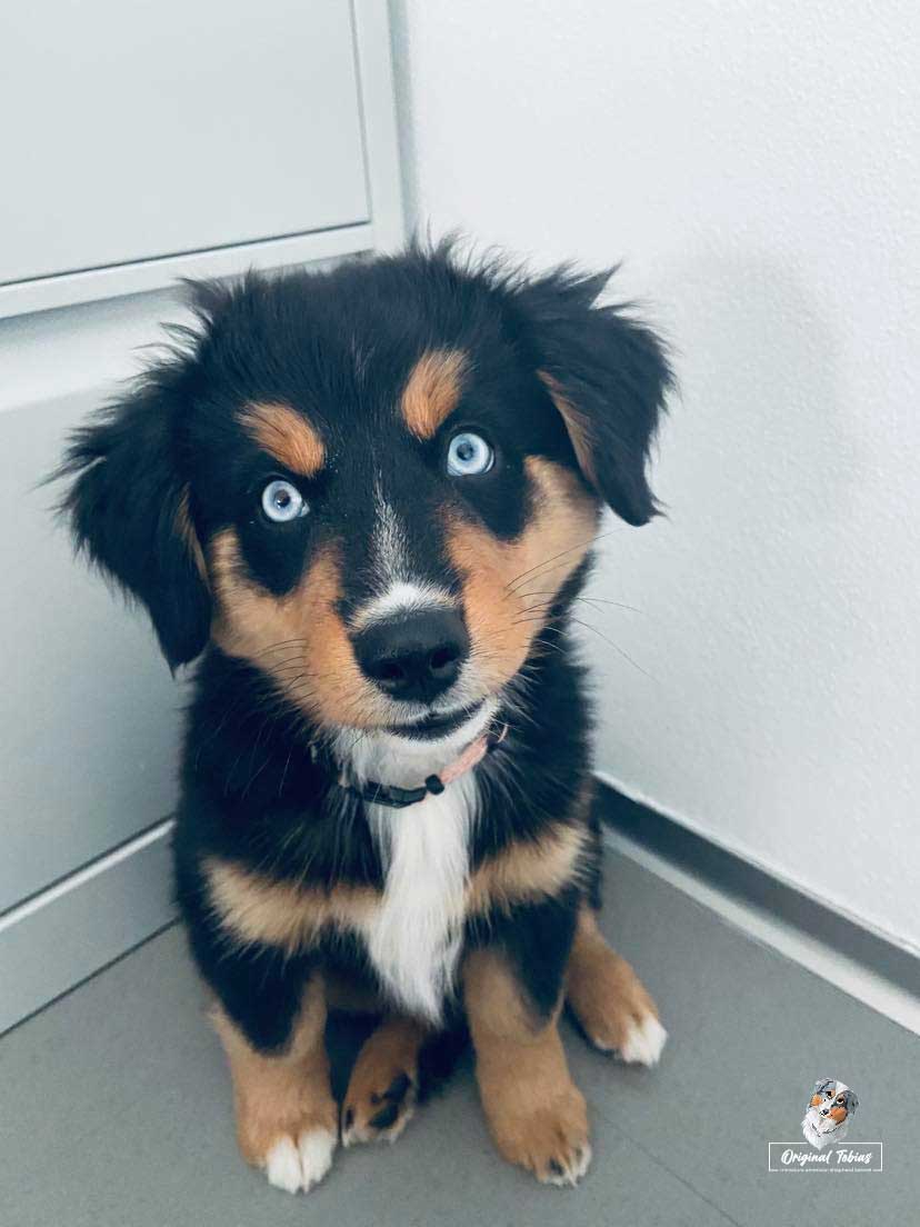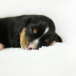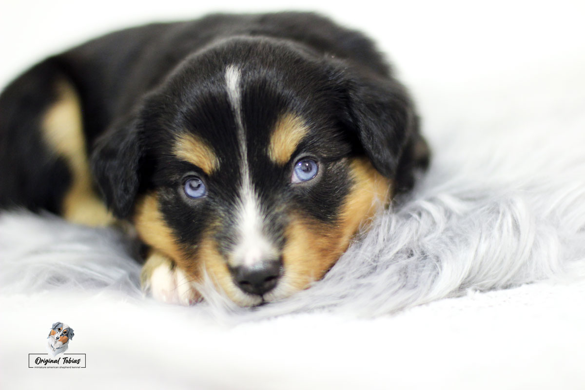 Jelikož je Abigail předposlední štěně, už docházela bílá barva. Proto má jen jemnou tenkou lysinku a bílé jen špičky prstíků. Abigail má jako jediná holčička obě oči modré. V kombinaci s její černou barvou bude mít krásný uhrančivý pohled.