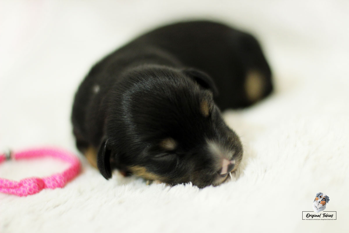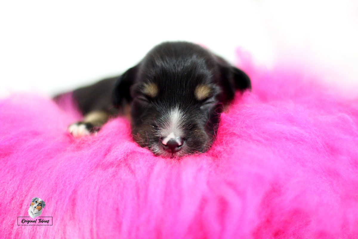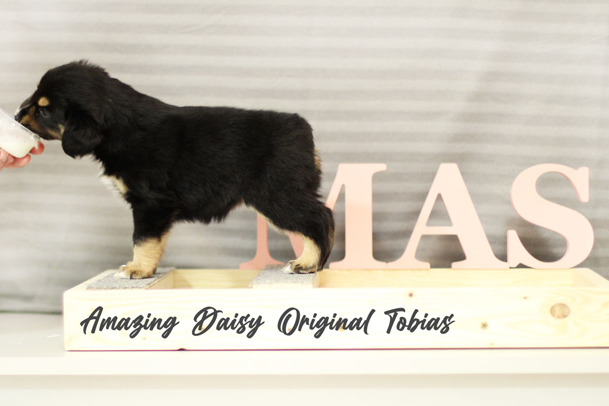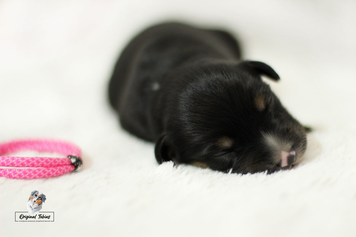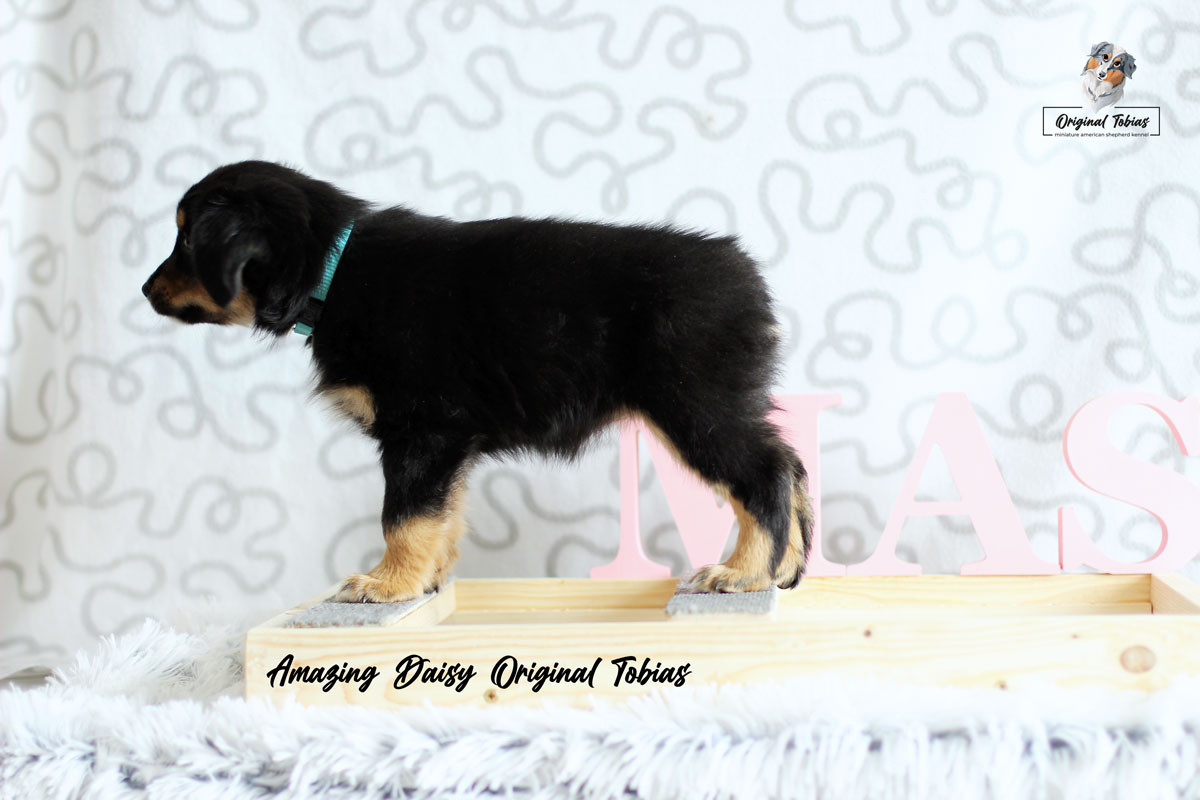 Amazing Daisy Original Tobias je black tri fenka, které jsme přiřadili růžovou barvičku. Daisy se narodila jako poslední a nejmenší štěně s váhou 255 g, v čase 16:55 dne 16. 2. 2021.