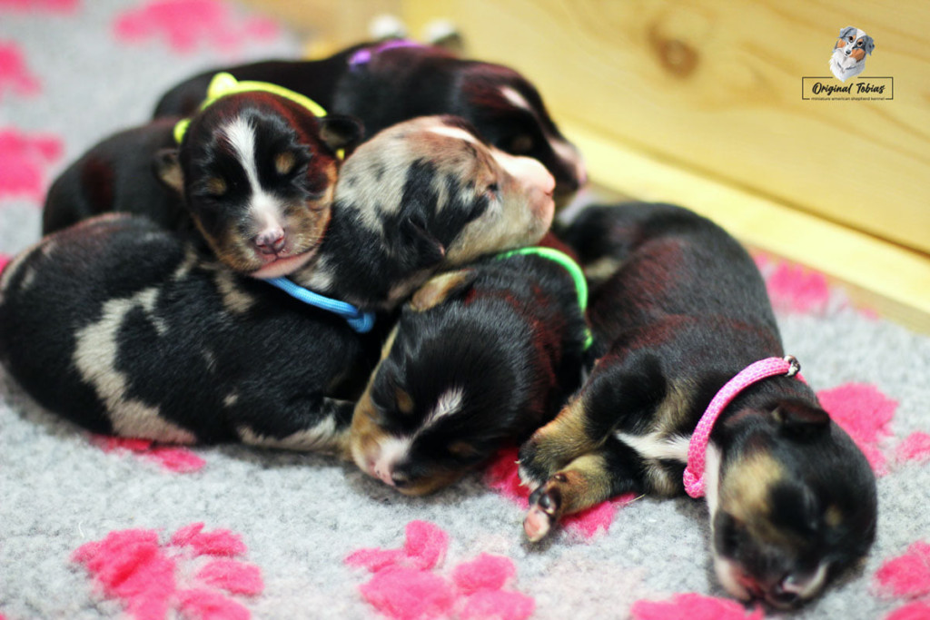 Naštěstí žádné z miminek nepotřebovalo dokrmovat a od prvního dne všechna perfektně prospívala. Začali jsme s ranou neurologickou stimulací, následně jsme učili čistotě, přikrmovali kaší, postupně přešli na granule a k tomu všemu jsme stíhali štěňata i vychovávat, učit se venčit venku, učit na vodítko a samozřejmě jsme zvali desítky návštěv na socializaci.